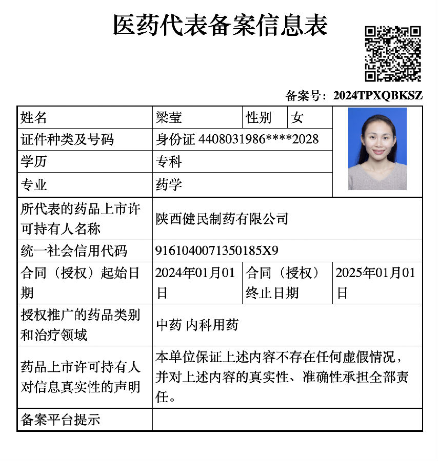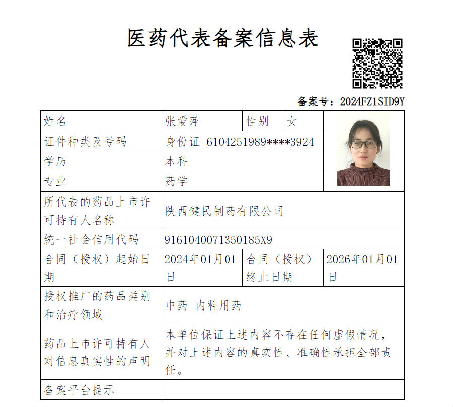 陕西健民制药有限公司医药代表信息公示